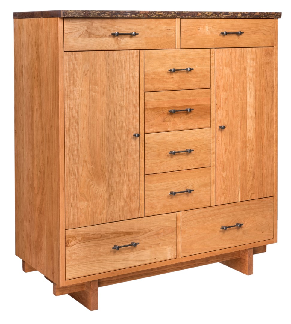 Features 2 deep and 6 smaller full extension dovetailed drawers, 1″ solid case, 1 3/8″ live edge top and 1/2″ back.